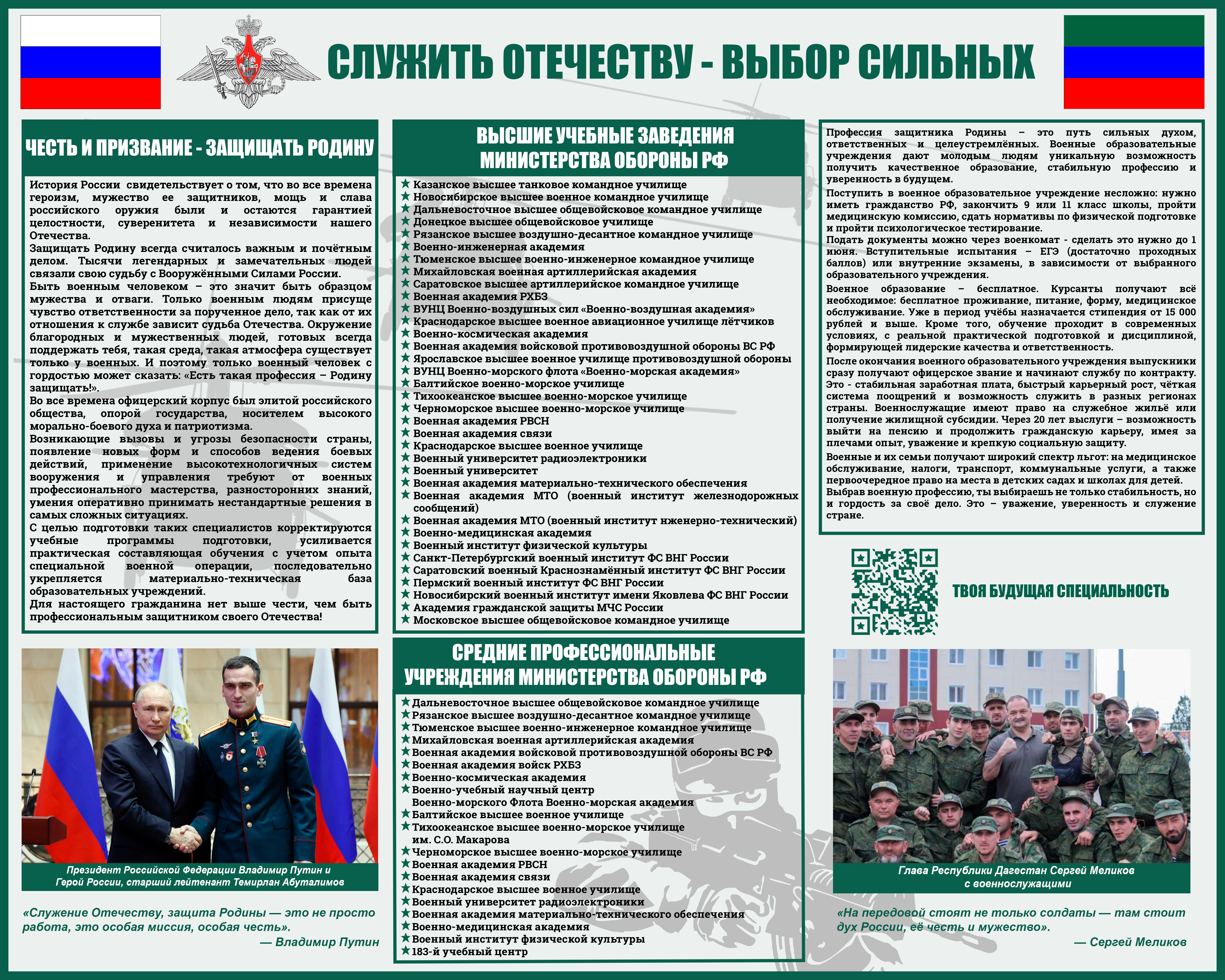 История России свидетельствует о том, что во все времена героизм, мужество ее защитников, мощь и слава российского оружия были и остаются гарантией целостности, суверенитета и независимости нашего Отечества. Защищать Родину всегда считалось важным и почётным делом. Тысячи легендарных и замечательных людей связали свою судьбу с Вооружёнными Силами России. Быть военным человеком – это значит быть образцом мужества и отваги. Только военным людям присуще чувство ответственности за порученное дело, так как от их отношения к службе зависит судьба Отечества. Окружение благородных и мужественных людей, готовых всегда поддержать тебя, такая среда, такая атмосфера существует только у военных. И поэтому только военный человек с гордостью может сказать: «Есть такая профессия – Родину защищать!». Во все времена офицерский корпус был элитой российского общества, опорой государства, носителем высокого морально-боевого духа и патриотизма. Возникающие вызовы и угрозы безопасности страны, появление новых форм и способов ведения боевых действий, применение высокотехнологичных систем вооружения и управления требуют от военных профессионального мастерства, разносторонних знаний, умения оперативно принимать нестандартные решения в самых сложных ситуациях. С целью подготовки таких специалистов корректируются учебные программы подготовки, усиливается практическая составляющая обучения с учетом опыта специальной военной операции, последовательно укрепляется материально-техническая база образовательных учреждений. Для настоящего гражданина нет выше чести, чем быть профессиональным защитником своего Отечества!